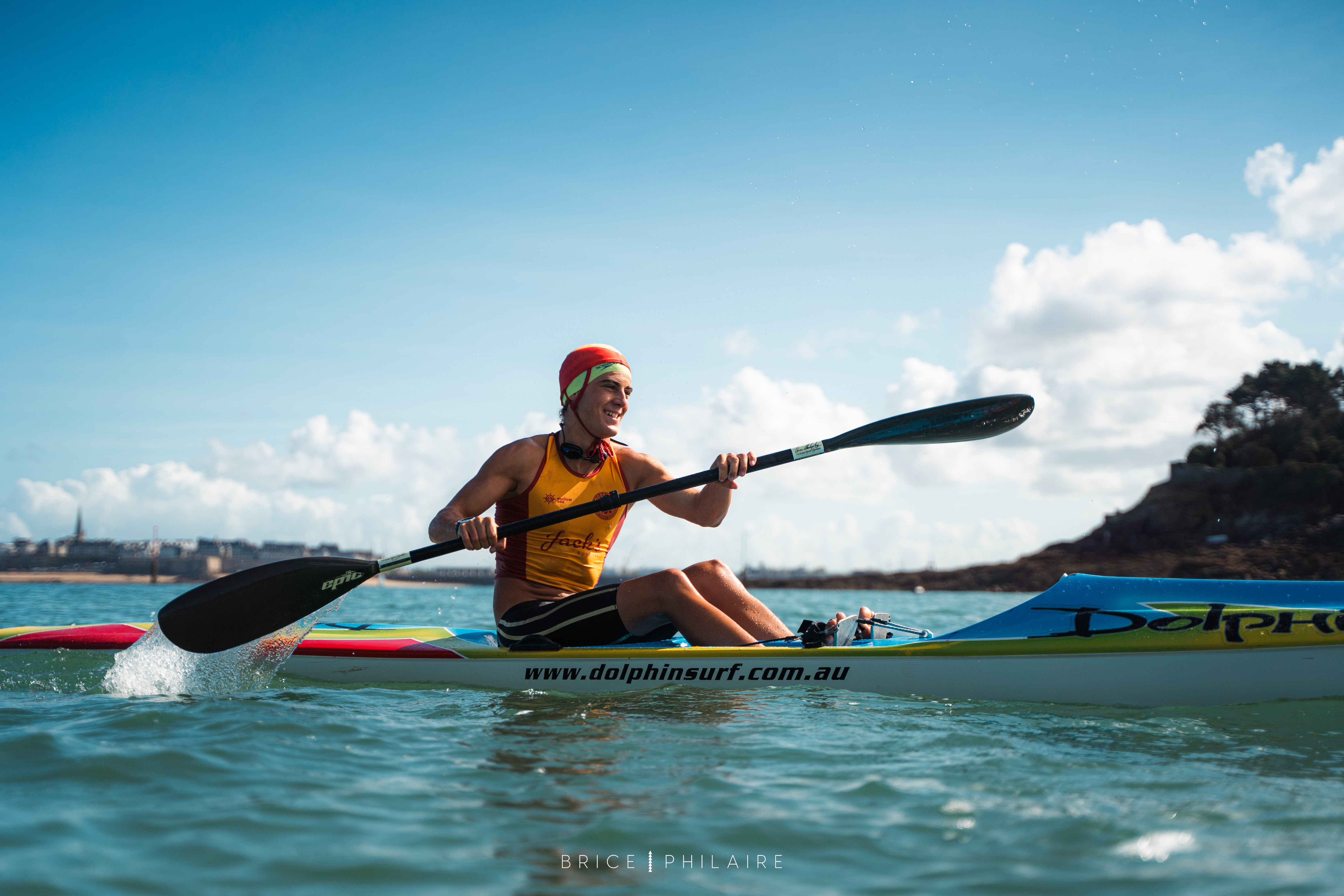 Le départ se fait dans l’eau et les sauveteurs doivent effectuer un parcours délimité par des bouées avec leur surf ski, avant de revenir vers la plage pour passer la ligne d’arrivée.