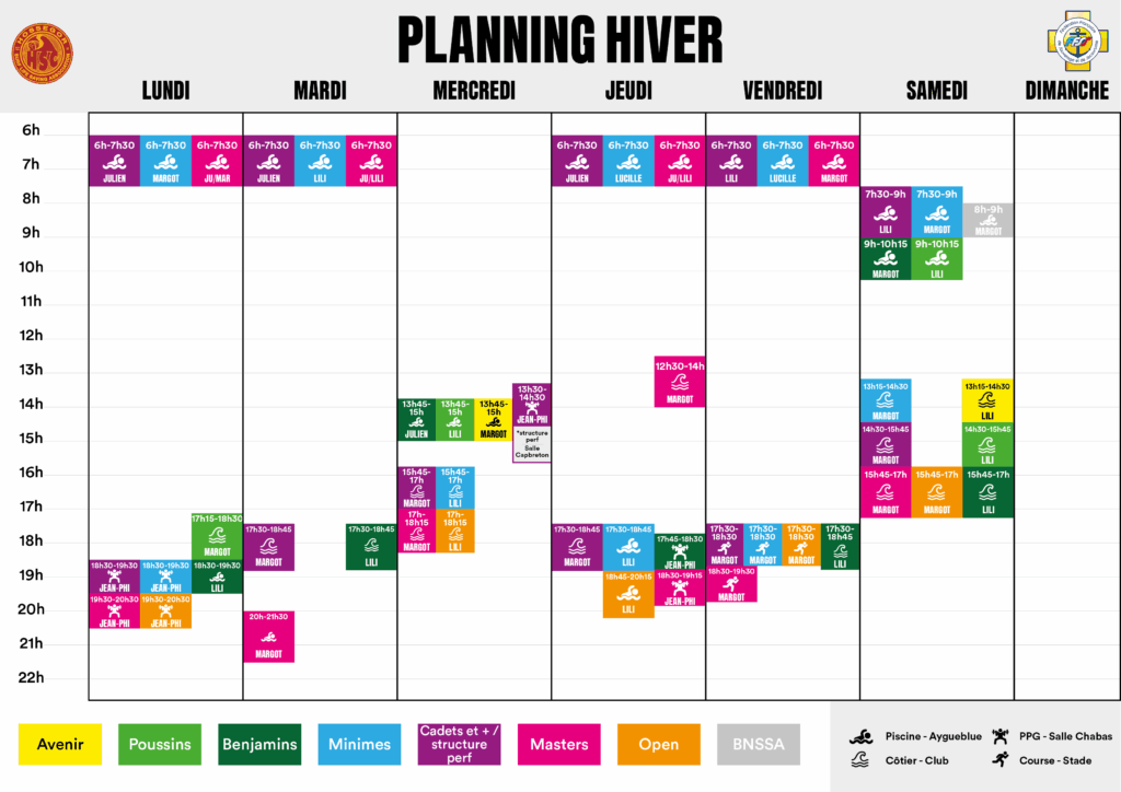 Les entrainements de piscine se font à la Aygueblue (Saint-Geours-de-Maremne), les entrainements de Côtier sont à la plage Centrale d’Hossegor à notre local sur la plage en dessous de la place des Landais, les entrainements course à pied se font au stade de Capbreton et les séances PPG dans la Salle Chabas.